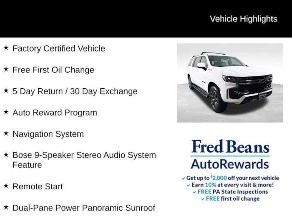 2022 Chevrolet Suburban Z71 EcoTec3 5.3L V8 10-Speed Automatic with Overdrive 4WD 4D Sport Utility Summit White Factory Certified Vehicle, Free First Oil Change, 5 Day Return / 30 Day Exchange, Auto Reward Program, Apple CarPlay/Android Auto, Bose 9-Speaker Stereo Audio System Feature, Dual-Pane Power Panoramic Sunroof, Navigation System, Remote Start, Wireless Charging.