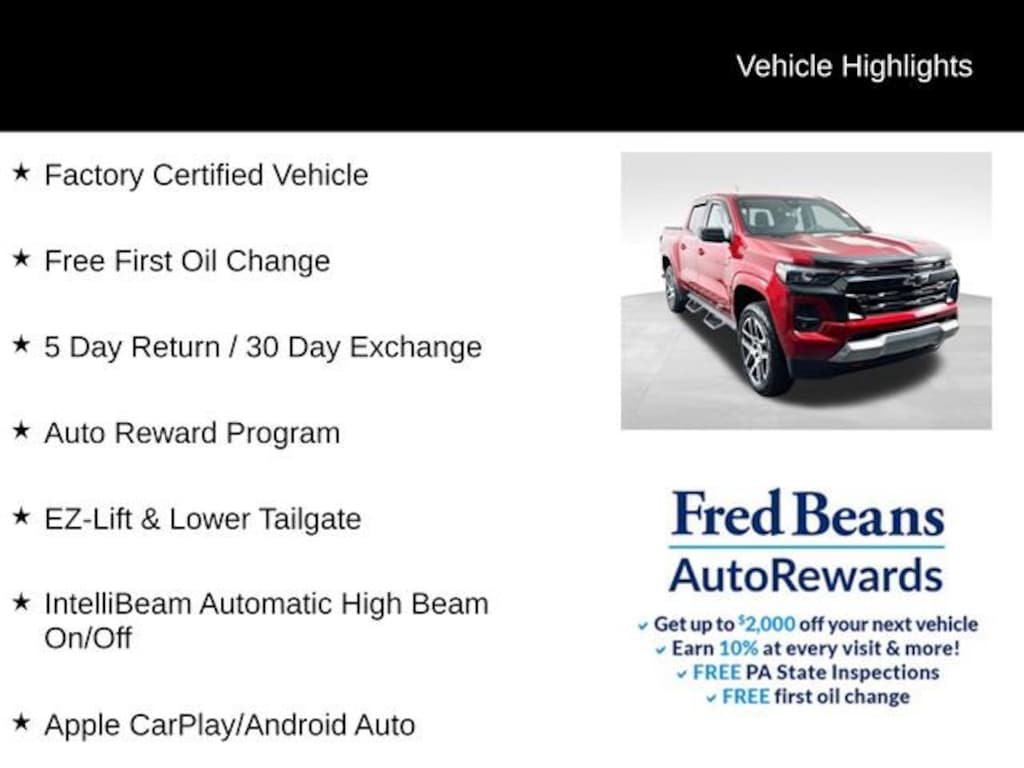 2024 Chevrolet Colorado Z71 2.7L I4 Turbocharged DOHC 16V LEV3-ULEV50 310hp 8-Speed Automatic 4WD 4D Crew Cab Radiant Red Tintcoat Factory Certified Vehicle, Free First Oil Change, 5 Day Return / 30 Day Exchange, Auto Reward Program, 4WD, Apple CarPlay/Android Auto, EZ-Lift & Lower Tailgate, IntelliBeam Automatic High Beam On/Off.