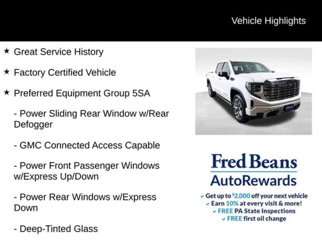 Recent Arrival! 2023 GMC Sierra 1500 Denali EcoTec3 5.3L V8 10-Speed Automatic 4WD 4D Crew Cab White Frost Tricoat Great Service History, Factory Certified Vehicle, 10-Speed Automatic, 4WD, Atmosphere/Brownstone Leather, 120-Volt Instrument Panel Power Outlet, 170 Amp Alternator, 2 Charge/Data USB Ports Inside Center Console, 2 Type-C Charge-Only Rear USB Ports, 2 USB Ports, Auto-Locking Rear Differential, Auxiliary External Transmission Oil Cooler, Bed View Camera, Chrome Header w/Signature Denali Chrome Grille, Chrome Recovery Hooks, Chrome Wheel To Wheel Assist Steps, Color-Keyed Carpeting Floor Covering, Compass, Deep-Tinted Glass, Denali Reserve Package, Electric Rear-Window Defogger, Electrical Steering Column Lock, Floor-Mounted Center Console, Front Rainsensing Wipers, GMC Connected Access Capable, GMC MultiPro Power Steps, HD Surround Vision, Heated 2nd Row Outboard Seats, Heated Driver & Front Outboard Passenger Seating, Heavy-Duty Air Filter, Hill Descent Control, Hitch Guidance w/Hitch View, In-Vehicle Trailering App, Integrated Trailer Brake Controller, Keyless Open & Start, LED Cargo Area Lighting, OnStar & GMC Connected Services Capable, Perimeter Lighting, Power Door Locks, Power Front Passenger Windows w/Express Up/Down, Power Front Windows w/Driver Express Up/Down, Power Rake & Telescoping Steering Column, Power Rear Windows w/Express Down, Power Sliding Rear Window w/Rear Defogger, Power Sunroof, Preferred Equipment Group 5SA, Premium Bose 7-Speaker Sound System, Push Button Start, Rear Cross Traffic Braking, Rear Pedestrian Detection, Rear Wheelhouse Liners, Remote Vehicle Starter System, SiriusXM w/360L, Spray-On Pickup Bed Liner w/Denali Logo, Steering Wheel Audio Controls, Technology Package, Theft Deterrent System (Unauthorized Entry), Trailer Camera Provisions, Trailer Side Blind Zone Alert, Trailering Package, Ultrasonic Front & Rear Park Assist, Universal Home Remote, Ventilated Driver & Front Passenger Seats, Wheels: 22 x 9 Painted Aluminum, Wi-Fi Hotspot Capable, Wireless Charging, Wireless Phone Projection.