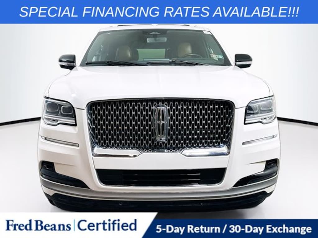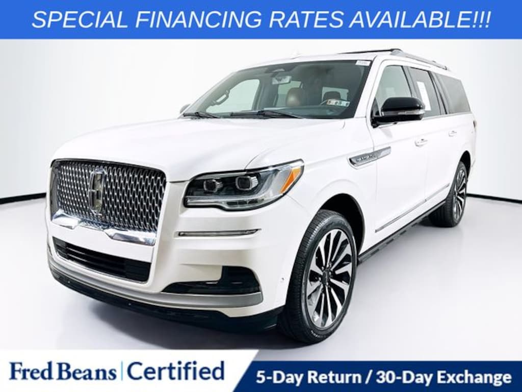 This 2023 Lincoln Navigator L Reserve comes equipped with a V6 engine, a 10-speed automatic transmission, and 4WD, finished in Pristine White Metallic Tri-Coat. It carries the remainder of its factory warranty and is fully factory certified. Ownership benefits include a free first oil change, a 5-day return and 30-day exchange program, and access to the Auto Rewards Program.