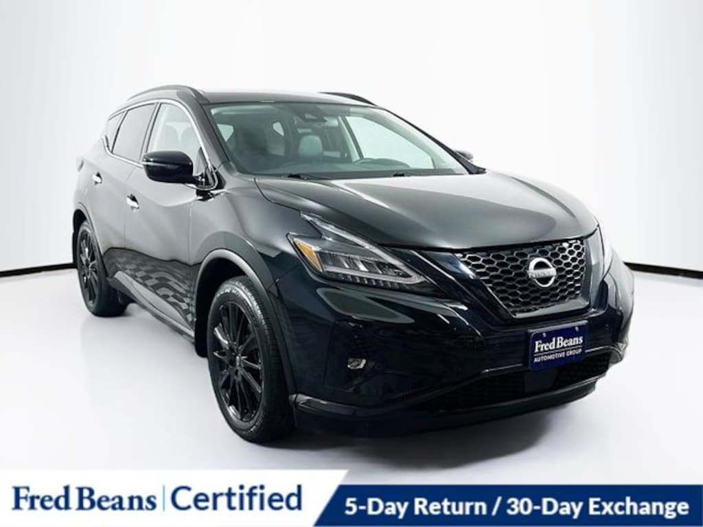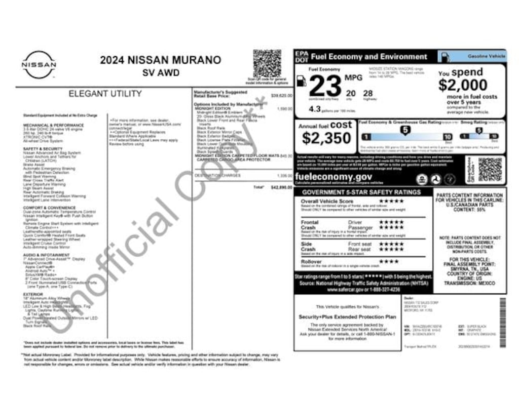 2024 Nissan Murano SV 3.5L V6 DOHC 24V CVT with Xtronic AWD 4D Sport Utility Super Black 3 Month / 4,000 Mile Comprehensive Warranty, Ford Blue Advantage Certified, AM/FM radio: SiriusXM, Automatic temperature control, Black Splash Guards, Front dual zone A/C, Front fog lights, Heated door mirrors, Heated Front Bucket Seats, Illuminated Kickplates, Leatherette-Appointed Seat Trim, Midnight Edition Badge, NissanConnect featuring Apple CarPlay and Android Auto, Power door mirrors, Power driver seat, Power passenger seat, Power windows, Rear window defroster, Rear window wiper, Remote keyless entry, Speed control, SV Midnight Edition Package, Tilt steering wheel, Turn signal indicator mirrors, Wheels: 20" Gloss Black Aluminum Alloy. 20/28 City/Highway MPG
