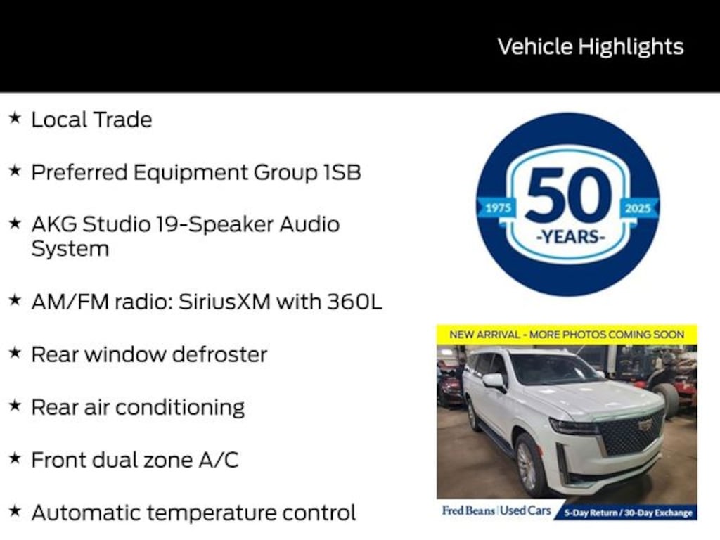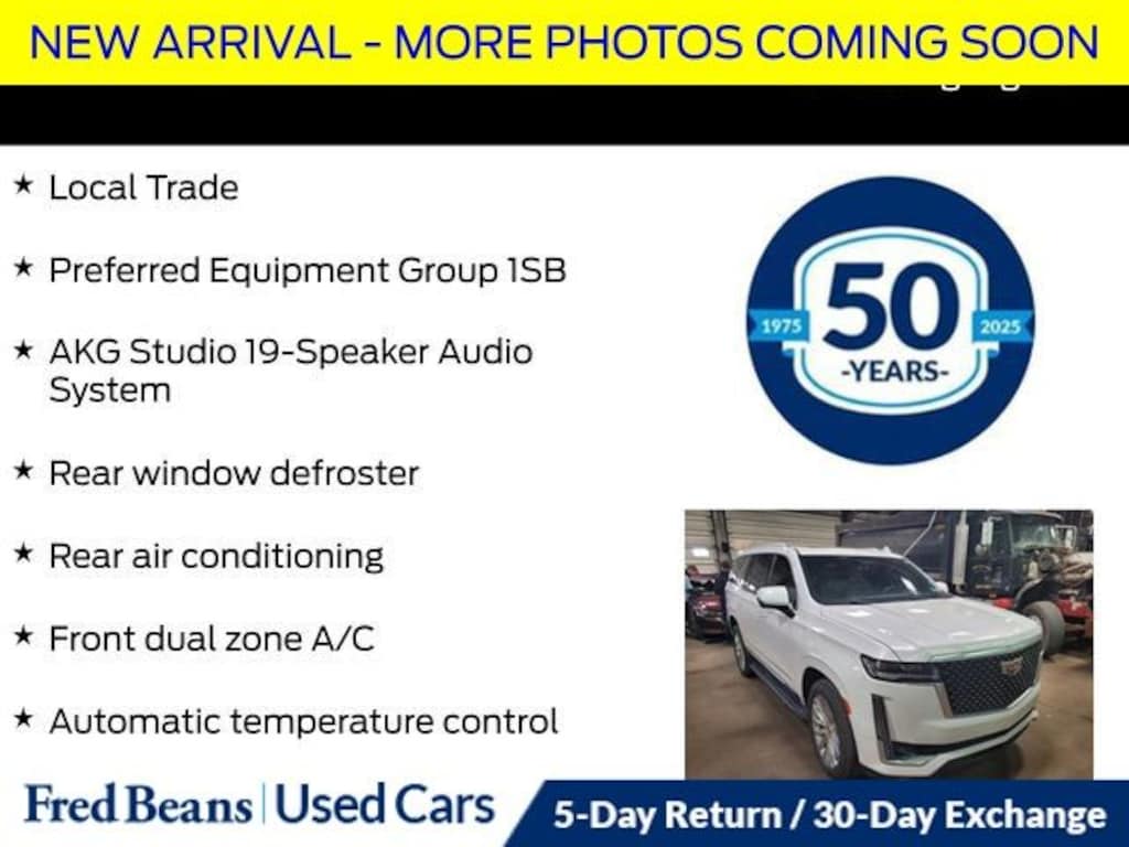 Recent Arrival! 2023 Cadillac Escalade Premium Luxury 6.2L V8 10-Speed Automatic AWD 4D Sport Utility Crystal White Tricoat Local Trade, 8-Way Power Driver Seat Adjuster, 8-Way Power Front Passenger Seat Adjuster, Adaptive Cruise Control, AKG Studio 19-Speaker Audio System, AM/FM radio: SiriusXM with 360L, Automatic Seat Belt Tightening, Automatic temperature control, Door Lock & Latch Shields, Enhanced Automatic Emergency Braking, Enhanced Automatic Parking Assist, Exterior Parking Camera Rear, Front dual zone A/C, Glass Breakage Sensor, Heated & Ventilated Driver & Front Passenger Seats, Heated door mirrors, Heated rear seats, Heated steering wheel, Lane Change Alert w/Side Blind Zone Alert, Mechanical Limited-Slip Differential, Power door mirrors, Power Liftgate, Power Panoramic Tilt-Sliding Sunroof, Power passenger seat, Power windows, Preferred Equipment Group 1SB, Rear air conditioning, Rear Camera Mirror, Rear Camera Mirror Washer, Rear Cross Traffic Alert, Rear window defroster, Reconfigurable Full-Color Head-Up Display, Remote keyless entry, Reverse Automatic Braking, Running Board Assist Steps, Theft-Deterrent Alarm System, Tilt steering wheel, Vehicle Inclination Sensor, Vehicle Interior Movement Sensor, Wheel Locks, Wheels: 22" 14-Spoke Alloy w/Polished Finish, Wireless Apple CarPlay/Wireless Android Auto.
