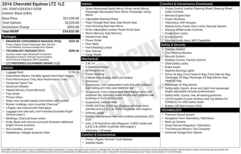 Recent Arrival! 2016 Chevrolet Equinox LTZ 2.4L 4-Cylinder SIDI DOHC VVT 6-Speed Automatic with Overdrive AWD 4D Sport Utility Black 18" Aluminum Wheels, 6 Speaker Audio System Feature, 8-Way Power Driver Seat Adjuster, 8-Way Power Front Passenger Seat Adjuster, Automatic temperature control, Bluetooth® For Phone, Deluxe Front Bucket Seats, Enhanced Convenience Package, Equipment Group LTZ, Exterior Parking Camera Rear, Front fog lights, Heated Driver & Front Passenger Seats, Perforated Leather-Appointed Seat Trim, Pioneer Premium Audio System Feature, Power door mirrors, Power driver seat, Power Programmable Rear Liftgate, Power windows, Radio: Chevrolet MyLink Audio System w/Navigation, Rear window defroster, Rear window wiper, Remote keyless entry, Technology Package, Tilt steering wheel, Universal Home Remote. 20/29 City/Highway MPG