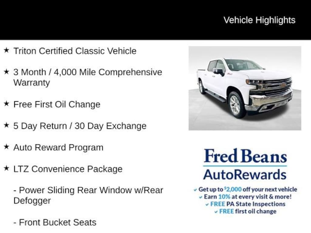 As a Triton Certified Classic Vehicle, this 2019 Silverado 1500 LTZ has been meticulously inspected and reconditioned to the highest standards. You can drive with confidence, knowing it comes with a comprehensive 3-month/4,000-mile warranty and a free first oil change. Plus, you'll enjoy the added benefits of the Auto Reward Program and a 5-day return/30-day exchange policy.