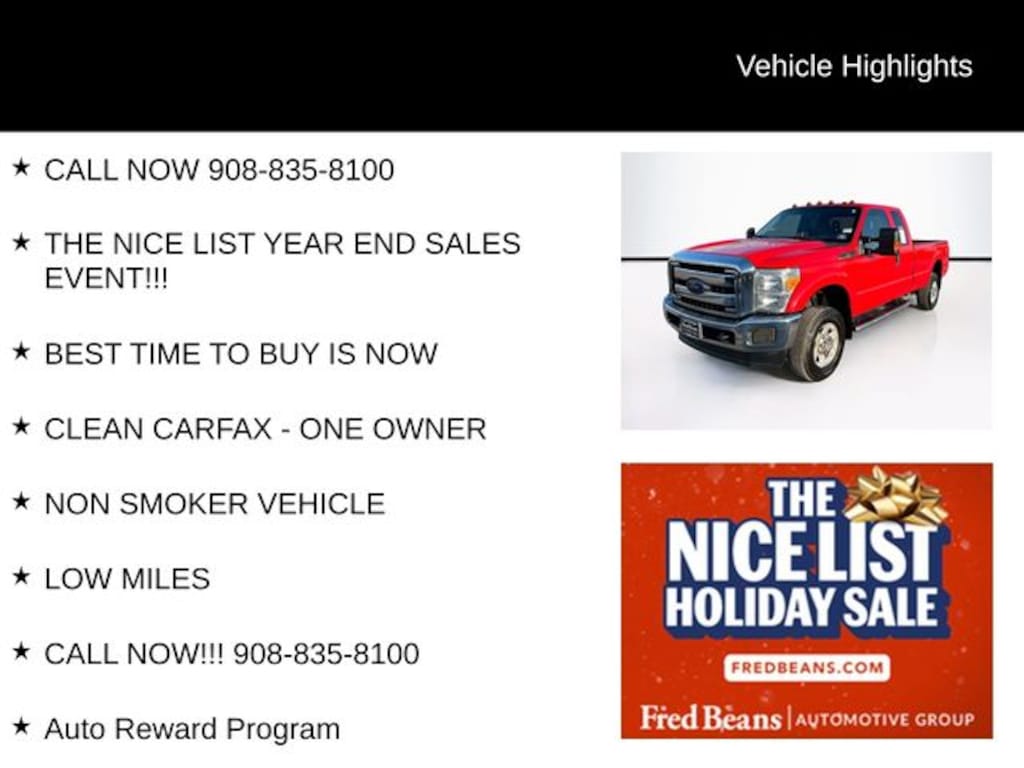 CALL NOW 908-835-8100, THE NICE LIST YEAR END SALES EVENT!!!, BEST TIME TO BUY IS NOW, CLEAN CARFAX - ONE OWNER, NON SMOKER VEHICLE, LOW MILES, CALL NOW!!! 908-835-8100, Auto Reward Program, SOLD AS-IS, CALL NOW - 908-835-8100, AN ESTIMATE FOR NEEDED REPAIRS IS AVAILABLE, THE LIST OF NEEDED REPAIRS INCLUDES: WIPER BLADES, FREE-UP THE PARKING BRAKE LEVERS, LEFT SIDE TAILLAMP, RIGHT FRONT SIDE MARKER BULB, A/C COMPRESSOR AND A/C SYSTEM RECHARGE, OIL AND FILTER CHANGE, REPLACE THE BATTERY, SEVERAL BED SUPPORT RAILS ARE ROTTED OUT, BRAKES MEASURE 8 MM FRONT AND 10 MM REAR, TIRES MEASURE 5/32 FRONT AND 5/32 REAR, THE VEHICLE IS SOLD AS-IS AND THE BUYER IS RESPONSIBLE FOR COMPLETING ALL REPAIRS, THE RETAIL PRICE HAS BEEN ADJUSTED (LOWERED) TO ACCOMODATE THE NEEDED REPAIRS, 4WD, Electronic Locking w/3.73 Axle Ratio, GVWR: 10,000 lb Payload Package, Security system, Snow Plow Prep Package, Traction control. Recent Arrival! 2016 Ford F-250SD XLT 6.2L V8 EFI SOHC 16V Flex Fuel TorqShift 6-Speed Automatic 4WD 4D Extended Cab Race Red