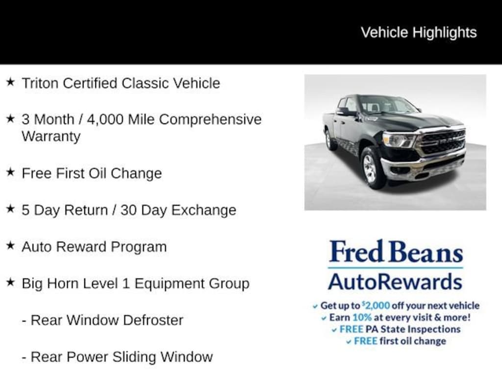 2022 Ram 1500 Big Horn/Lone Star 3.6L V6 24V VVT 8-Speed Automatic 4WD 4D Quad Cab Diamond Black Crystal Pearlcoat Triton Certified Classic Vehicle, 3 Month / 4,000 Mile Comprehensive Warranty, Free First Oil Change, 5 Day Return / 30 Day Exchange, Auto Reward Program, 4G LTE Wi-Fi Hot Spot, 8.4 Touchscreen Display, Apple CarPlay, Auto-Dimming Exterior Driver Mirror, Auto-Dimming Rear-View Mirror, Big Horn Level 1 Equipment Group, Black Exterior Mirrors, Black Premium Power Mirrors, Bluetooth Handsfree Phone & Audio, Class IV Receiver Hitch, Connectivity - US/Canada, Convex Wide-Angle Mirror Insert, Exterior Mirrors Courtesy Lamps, Exterior Mirrors w/Heating Element, Exterior Mirrors w/Supplemental Signals, For Details, Visit DriveUconnect.com, For More Info, Call 800-643-2112, Global Telematics Box Module (TBM), Glove Box Lamp, Google Android Auto, GPS Antenna Input, Integrated Center Stack Radio, Power 2-Way Driver Lumbar Adjust, Power 8-Way Driver Seat, Power Adjustable Pedals, Power-Folding Mirrors, Radio: Uconnect 5 W w/8.4 Display, Rear Dome w/On/Off Switch Lamp, Rear Power Sliding Window, Rear Window Defroster, SiriusXM Radio Service, SiriusXM Satellite Radio, Sun Visors w/Illuminated Vanity Mirrors, Universal Garage Door Opener, USB Host Flip.