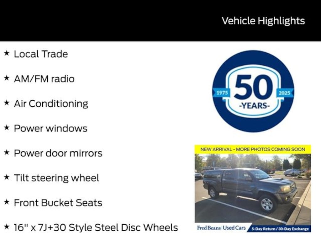 My first car when I got my license! I absolutely love this truck. Plenty of power from the standard 4-cylinder engine, smooth automatic transmission, and GREAT gas mileage, about 25 miles to the gallon on the highway depending on driving conditions. My radio and auxiliary/iPod hookup both started having problems and were replaced under warranty. Apparently a lot of 2010 model year Toyota vehicles have had problems with the stereo system. Have not had any problems with new stereo. The blower motor for the heater and A/C started making a noise in late 2010 that got worse over time, and the Toyota dealer replaced it under warranty just 4 days prior to me writing this review. When the truck was brand new back in 2009, there was a problem whenever the automatic transmission was put into park. Sometimes it would lock properly and the vehicle would "think" it was still in drive or reverse and roll forward or backward. This was also fixed by the dealer under warranty and there has not been a problem since. In my opinion, it is not the little things like this that make a vehicle good or bad. The truck is extremely reliable and has not had any problems with the drivetrain (engine, transmission, etc), and it is also an extremely durable little truck. Despite being a 2-wheel drive, my truck does okay in mud and other messy conditions. I would NOT take it off-roading, but the traction control combined with superior engineering make it adequate in mud, water, and snow. The air-conditioner in my Tacoma is very powerful and blows FREEZING COLD. It performed flawlessly during all the summer 2011 heat waves we had. The heater will roast you out of the cab and if you hold your hand close to the vent when it is on full blast you will just about burn your hand! For a base model truck, my Tacoma has an adequate stereo system. It has an AM/FM CD/MP3 player with 4 speakers and a handy auxiliary plug-in for my iPod. The speakers are not very good and I sometimes have to turn the volume on full blast to hear the song. I plan on upgrading the speakers in the future with more powerful aftermarket units. This is pretty easy to do, so the speakers do not influence my overall rating of this truck. The only thing I truly HATE about my 2010 Toyota Tacoma is that it DOES NOT have variable-speed intermittent windshield wipers. It just has 2-speed wipers with a "mist" function (basically just flicking the control stick manually every few seconds during a drizzle), and a windshield washer. You do not realize how much you take intermittent wipers for granted until you've driven in a light rain without them! Even worse is that I did not even realize my truck didn't have this feature until TWO DAYS after we bought it! Apparently you have to get the "preferred convenience package" or something like that, which includes several other options like cruise control and drives the price up considerably. Even for the 2012 model year, the regular cab Tacoma is not available with intermittent wipers. According to a Toyota salesman I talked to, intermittent wipers are option on the 4-wheel drive regular cab, but not available on any 2-wheel drive regular cab. My neighbor has a 2010 Toyota Tacoma V6 4x4 extra cab with power windows and locks that did not even come with intermittent wipers! Anyway, this is all a matter of preference. To some people it does not matter if their car has intermittent wipers, and to some it does. I've started to get used to it (though I still plan on putting in intermittent wipers sometime in the future), but I just wanted to educate those who want to buy a new or used Tacoma about this fact before they decided to make a purchase. Except for the lack of intermittent wipers, I love the Toyota Tacoma and would absolutely recommend it to nayone looking for a compact pickup truck!… - 5.0