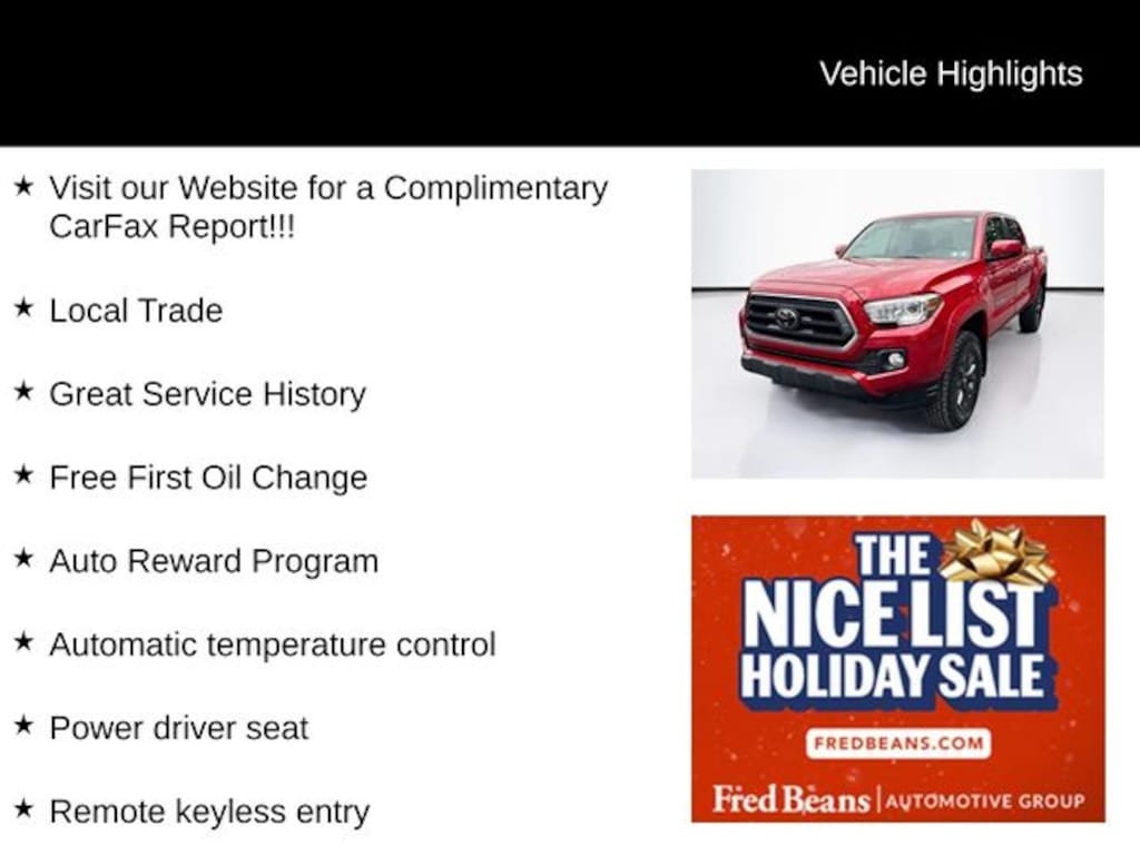 For added peace of mind, every Fred Beans used vehicle undergoes a rigorous 127-point inspection and comes with a 5-day return and 30-day exchange guarantee (excludes select vehicles). Our exclusive Auto Rewards Program offers unbeatable value, including a free first oil change, free PA State Safety Inspections, local merchant discounts, and more. You can even earn up to $2,000 toward your next vehicle just by servicing with us. As Fred Beans always saysâ"our used cars are better because our reputation depends on it. 2021 Toyota Tacoma SR5 V6