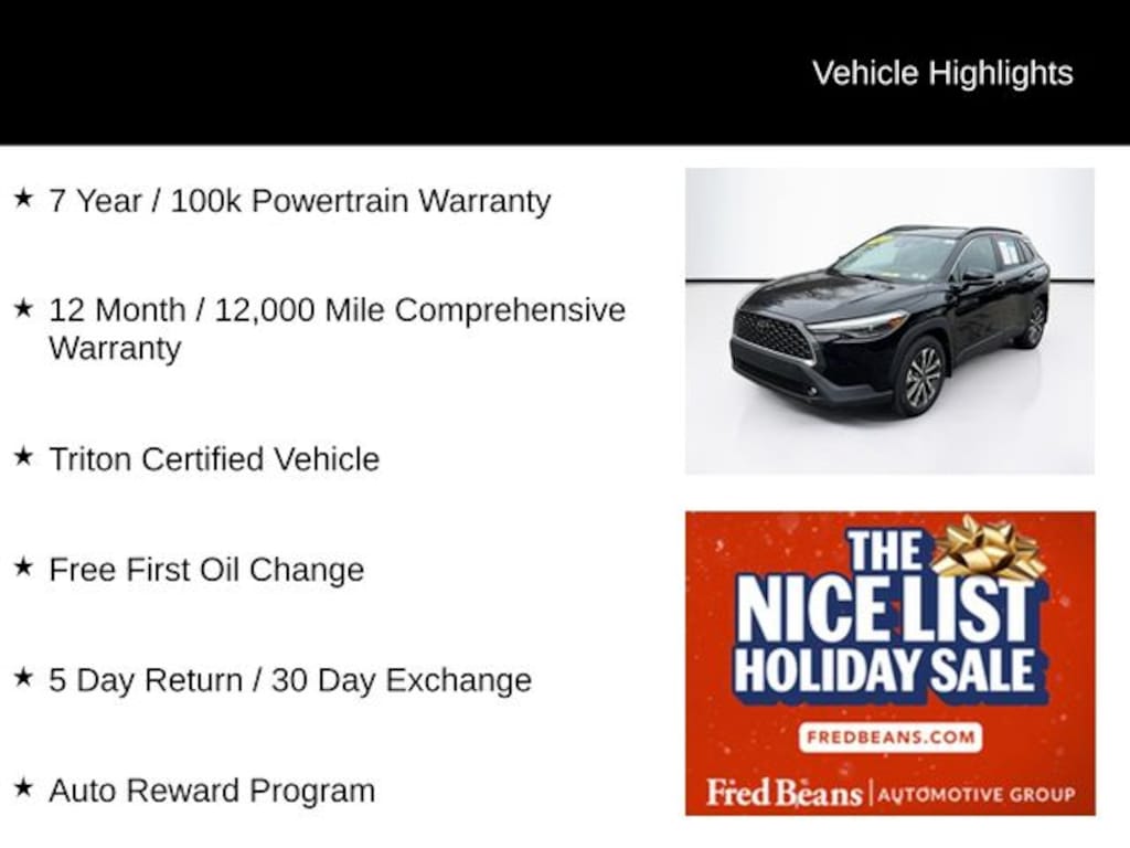 CARFAX One-Owner. Clean CARFAX. 29/32 City/Highway MPG 2022 Toyota Corolla Cross XLE 2.0L I4 PDI DOHC 16V LEV3-SULEV30 169hp CVT AWD 4D Sport Utility Black For better peace of mind all our used vehicles have a 127-point inspection and come with a 5-day return, 30-day exchange (As-Is vehicles are excluded). Our exclusive Auto Rewards Program provides better value with Free First Oil change, Free Pa State Safety inspections, discounts for local merchants and more. Plus, you can earn up to $2000 towards your next vehicle just by servicing with Fred Beans! As Fred Beans always says, our used cars are better because our reputation depends on it.