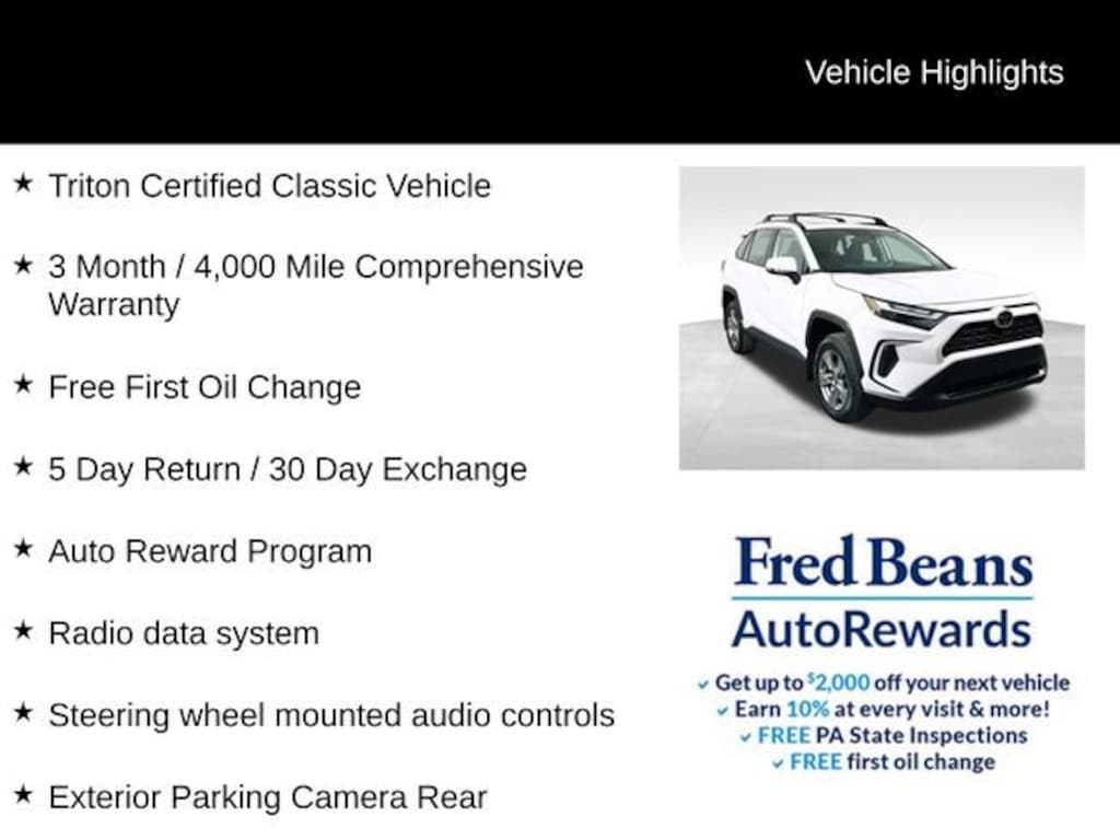 This Toyota RAV4 XLE is a Triton Certified Classic Vehicle, meaning it has undergone a rigorous inspection and reconditioning process to ensure it meets the highest standards of quality and reliability. With a 3 Month / 4,000 Mile Comprehensive Warranty and a Free First Oil Change, you can drive with confidence, knowing your investment is protected.