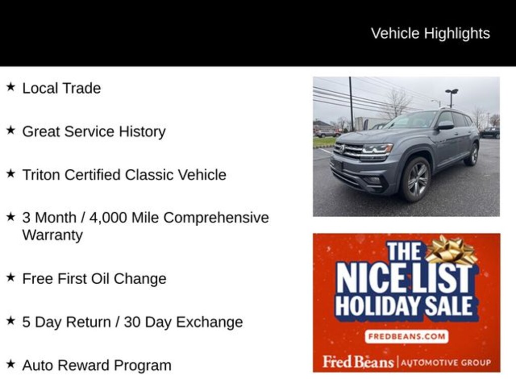 Recent Arrival! 2019 Volkswagen Atlas 3.6L V6 SE R-Line 3.6L V6 SE 3.6L VR6 8-Speed Automatic with Tiptronic AWD 4D Sport Utility Platinum Gray Metallic Local Trade, Great Service History, Triton Certified Classic Vehicle, 3 Month / 4,000 Mile Comprehensive Warranty, Free First Oil Change, 5 Day Return / 30 Day Exchange, Auto Reward Program.